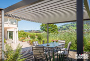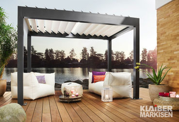 Formschöner Pavillon mit Faltmarkise oder Lamellendach und modularem Dachsystem.