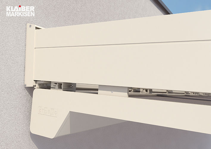 Die gesamte Konstruktion besteht aus Aluminium mit einer hochwertigen Pulverbeschichtung, welche auf Option in allen RAL-Farben individuell gefertigt wird. Für ein stets optimal gespanntes Tuch sorgt der seitlich integrierte Gasdruckmechanismus. Diverse Befestigungshalter ermöglichen eine flexible und einfache Montage – auch bei komplexen Unterkonstruktionen.